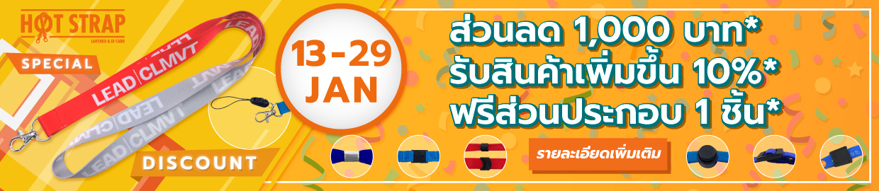- โปรโมชั่นที่ 2 แถมสายคล้องบัตรเพิ่มให้ฟรีอีก 10% ไม่มีขั้นต่ำ สูงสุด 1,000 เส้น