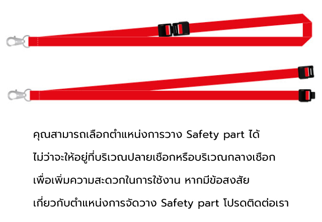 ชิ้นส่วนที่แข็งแรงนี้จะช่วยป้องกันให้สายคล้องคอหลุดออกจากคอยากขึ้น จุดที่สามารถติดตั้ง Safety part ได้ หรือคลิกที่นี่ เพื่อดูวิดิโอสาธิตการใช้งาน